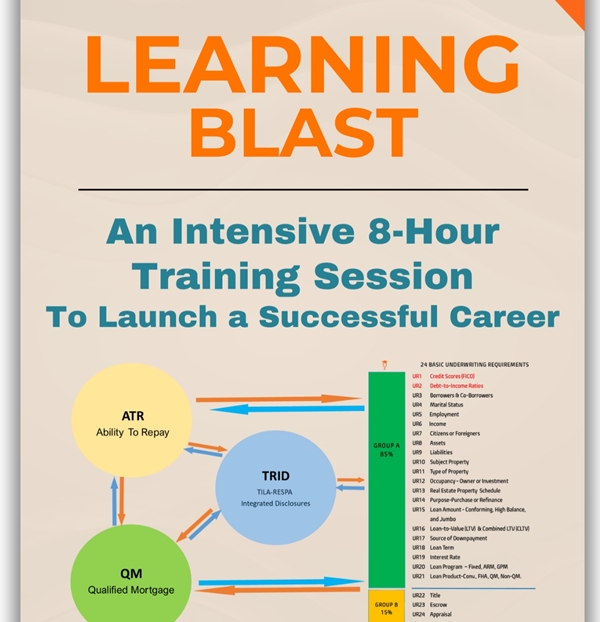 With the Learning Blast Training Series, you’ll leave equipped with the knowledge, processes, and confidence to originate loans efficiently, avoid costly mistakes, and build a successful career in the mortgage industry.